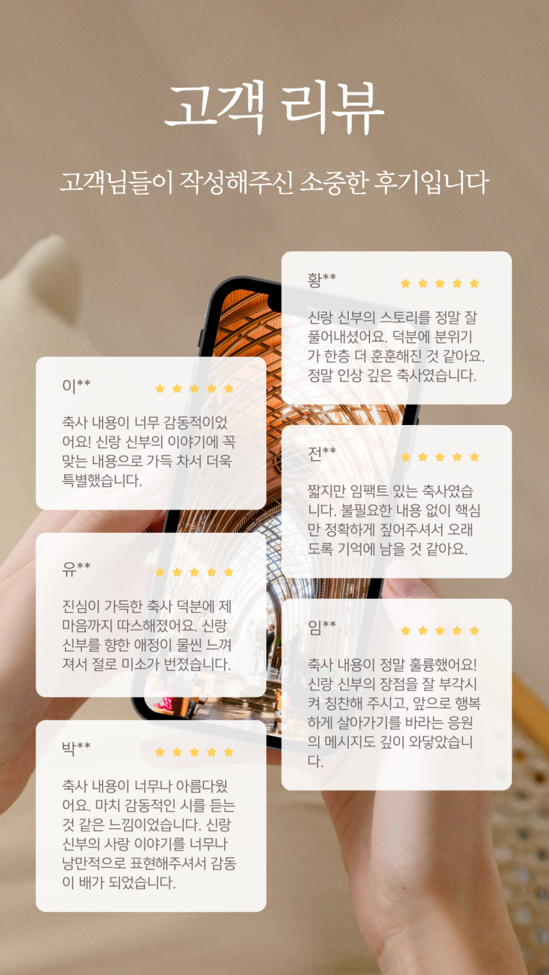 평범한 축사를 원하지 않으실 겁니다. 두 사람의 특별한 날, 그들의 사랑 이야기와 진심 어린 응원을 담은 의미 있는 순간을 만들고 싶으실 테니까요.